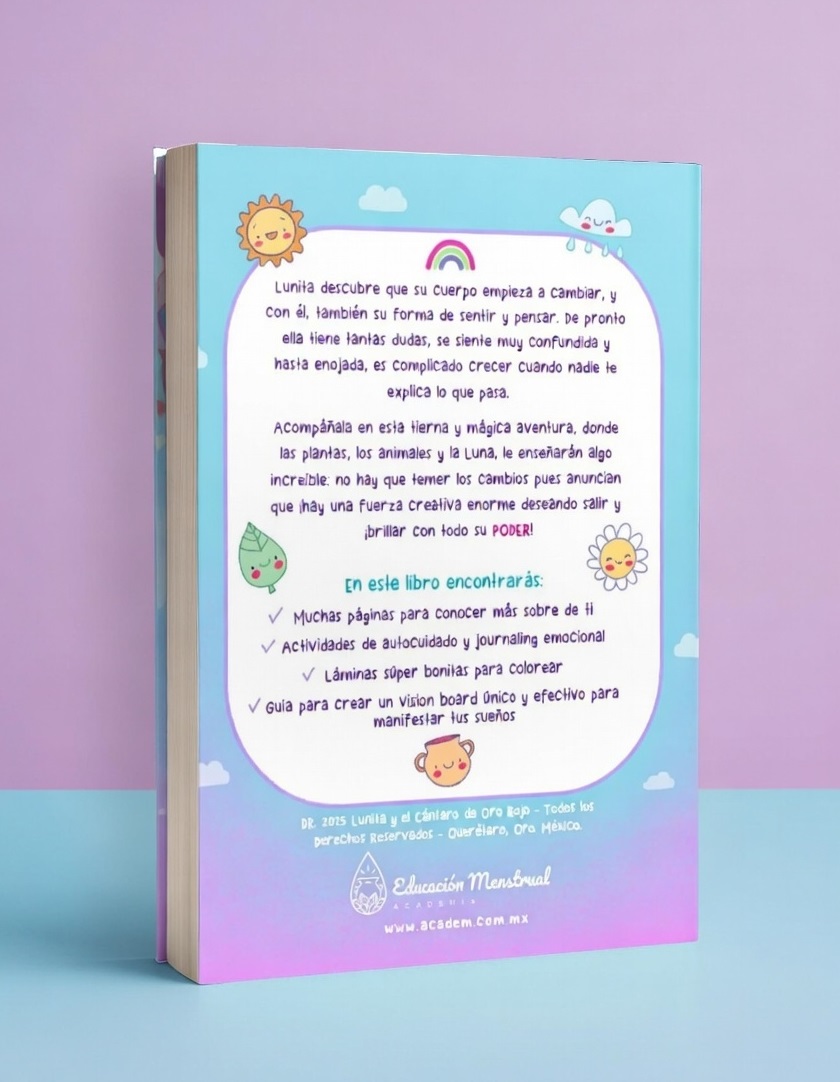 Escrito por la Fundadora de la Academia de Educación Menstrual, con más de 10 años de experiencia, Lunita y el Cántaro de Oro Rojo está diseñado para acompañar a niñas desde los 7 años, cuando empiezan a hacer preguntas y a observar su cuerpo con más curiosidad.
